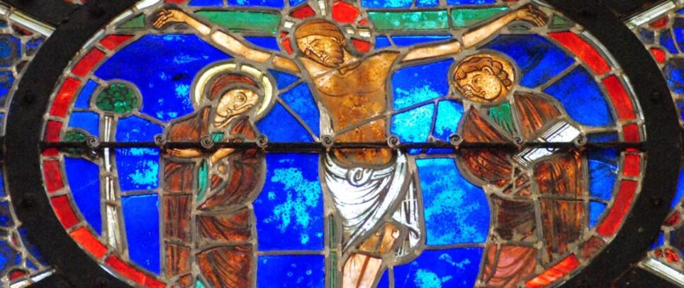 À l’instant, continuons à voir notre ligne ascendante de ce vitrail, comme l’illustration de l’abaissement du Fils de l’Homme. Entre le portement de croix avec la rencontre des femmes de Jérusalem et la mise au tombeau, voici Jésus mis en croix.