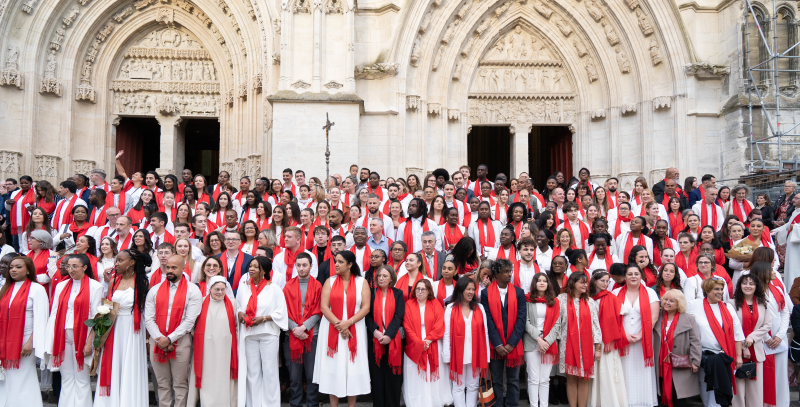 « L’Esprit Saint vient au secours de notre faiblesse, car nous ne savons pas prier comme il faut. L’Esprit lui-même intercède pour nous par des gémissements inexprimables » (Rm 8, 26). Mes amis, bienvenue dans cette cathédrale. Chacun de nous est habité par la foi et, en même temps, nous pouvons tous faire ce constat : nous ne savons pas prier comme il faut. Depuis des siècles, depuis les apôtres, et même bien avant, nous ne savons pas prier Dieu. Mes amis, tous nous prions Dieu, c’est le fruit du jaillissement de notre foi en nous. Nous savons que cette prière est pauvre et imparfaite. L’Esprit Saint vient nous soutenir dans notre faiblesse. Nous tous ici, nous reconnaissons devant Dieu notre faiblesse. Nous avons avec nous la force de notre foi mais, nous le reconnaissons humblement, nous sommes faibles, nous sommes pécheurs, de pauvres pécheurs.