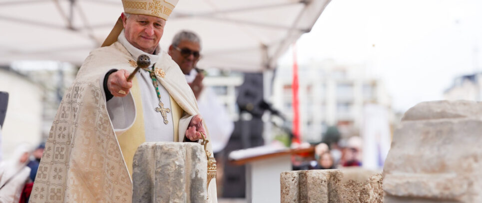 Le dimanche 26 janvier, Monseigneur Jean-Yves Nahmias, évêque de Meaux, accompagné du Nonce apostolique Celestino Migliore, a béni trois pierres provenant de l’ancienne abbaye royale. Ces pierres seront intégrées à la nouvelle église en hommage à l’histoire chrétienne de Sainte Bathilde et à la vocation missionnaire du lieu. Ainsi, la paroisse et la ville honorent leur passé tout en construisant un avenir missionnaire, catholique et ouvert à tous, au cœur de la ville.
