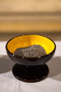 Le prêtre après avoir bénit les cendres des rameaux brûlés de l’année précédente marque d’une croix le front des croyants. En même temps il prononce la phrase « Souviens-toi que tu es poussière et que tu redeviendras poussière ».