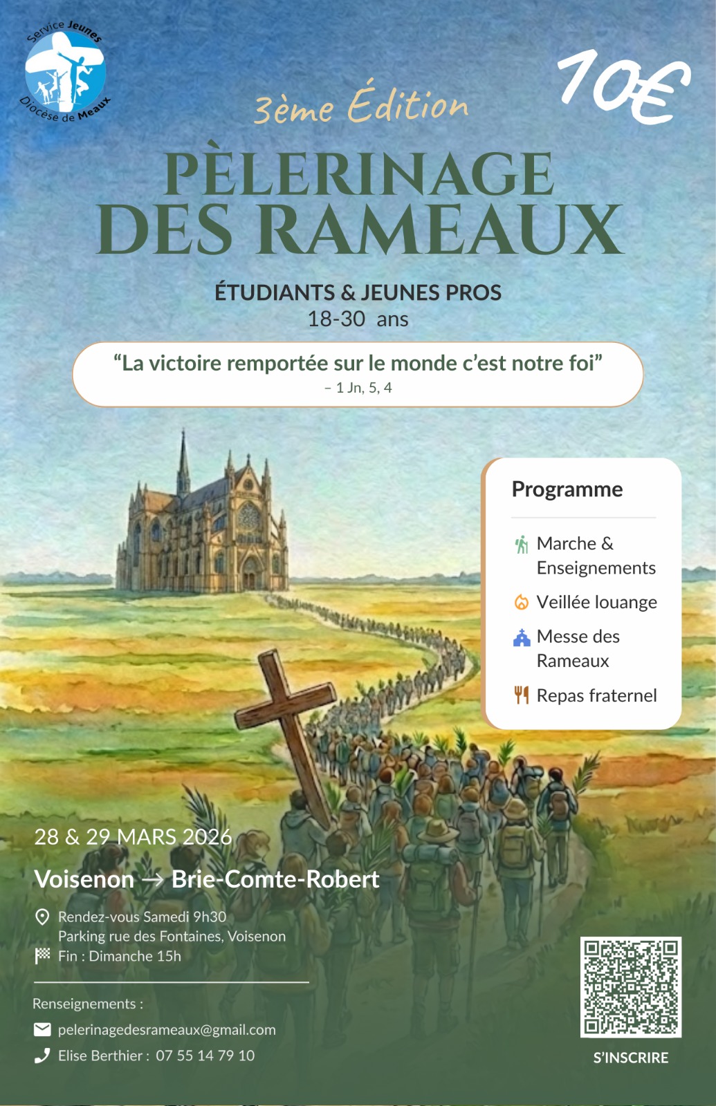 Nous vous invitons le samedi 28 mars jusqu'au dimanche 29 mars 2026, au pèlerinage des Rameaux ! Une marche de 20 km avec au programme : des temps d'enseignements et de partage, une veillée de prière. Le dimanche, nous vivrons ensemble la messe des Rameaux suivie d'un déjeuner fraternel. Le prix du week-end est de 10 €, venez nombreux !