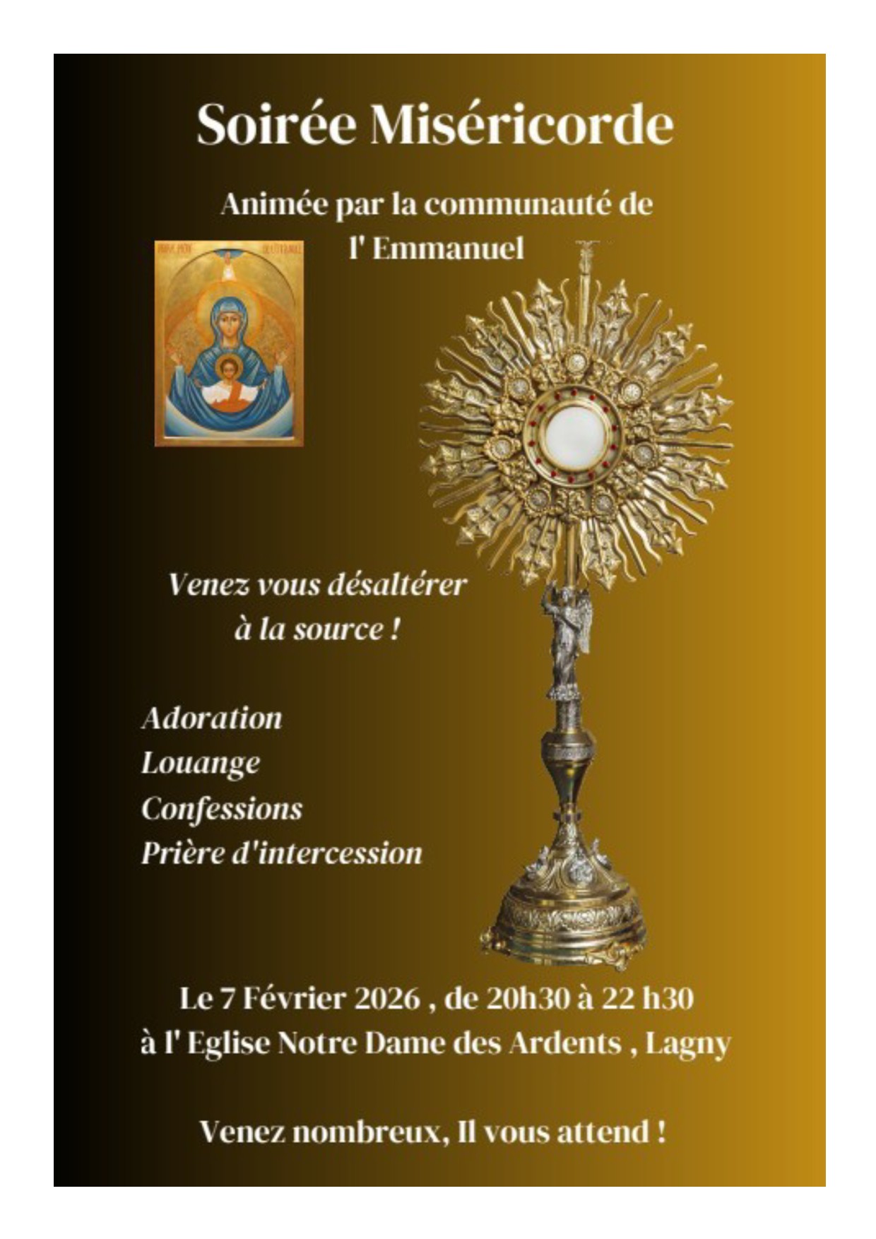 Le samedi 7 février à 20h30 en l'église Notre-Dame des Ardents à Lagny, soirée Miséricorde animée par la communauté de l'Emmanuel.